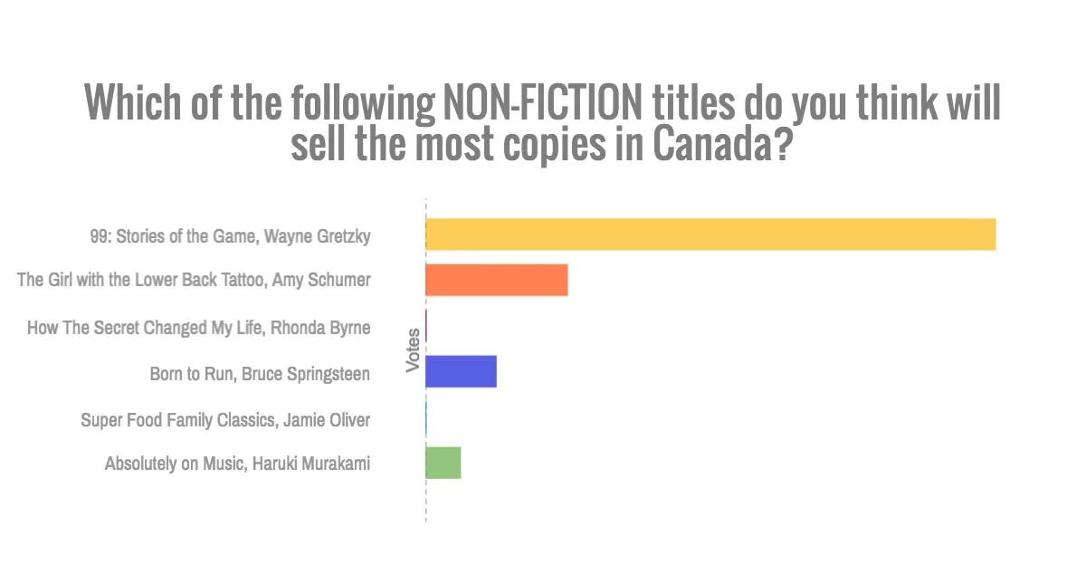 You nailed the popularity of Canada's great one, Wayne Gretzky. His memoir, 99, must have been the hot commodity under Christmas trees country-wide. But somehow you forgot about another hockey hero, Wendel Clark. His book Bleeding Blue probably earned a tidy profit for those of you who didn't quite pay top-dollar for it.