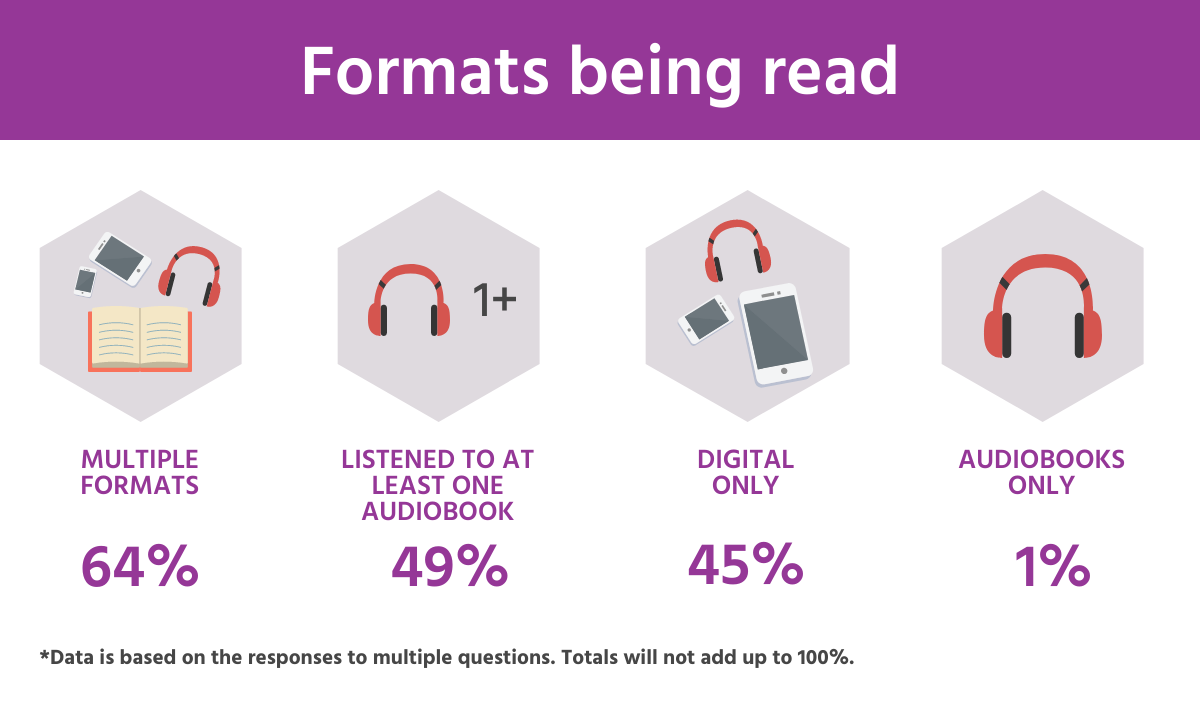 By now, you should be wondering, “What about reading?” We’re glad you asked. Out of the 1,000 readers, in the past year 45% read digital books only, 49% listened to at least one audiobook, 64% read multiple formats, and 1% listened exclusively to audiobooks.