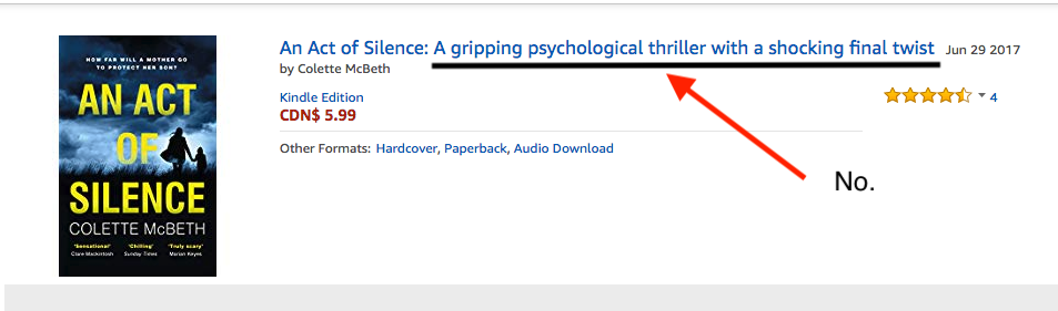 There's a marketing trend sweeping the nation(s) and it can be described in one word: terrible. Maybe you've seen it and it's also made your skin crawl? Often captured in the wild, here’s a recent sighting on Amazon for Colette McBeth’s An Act of Silence: