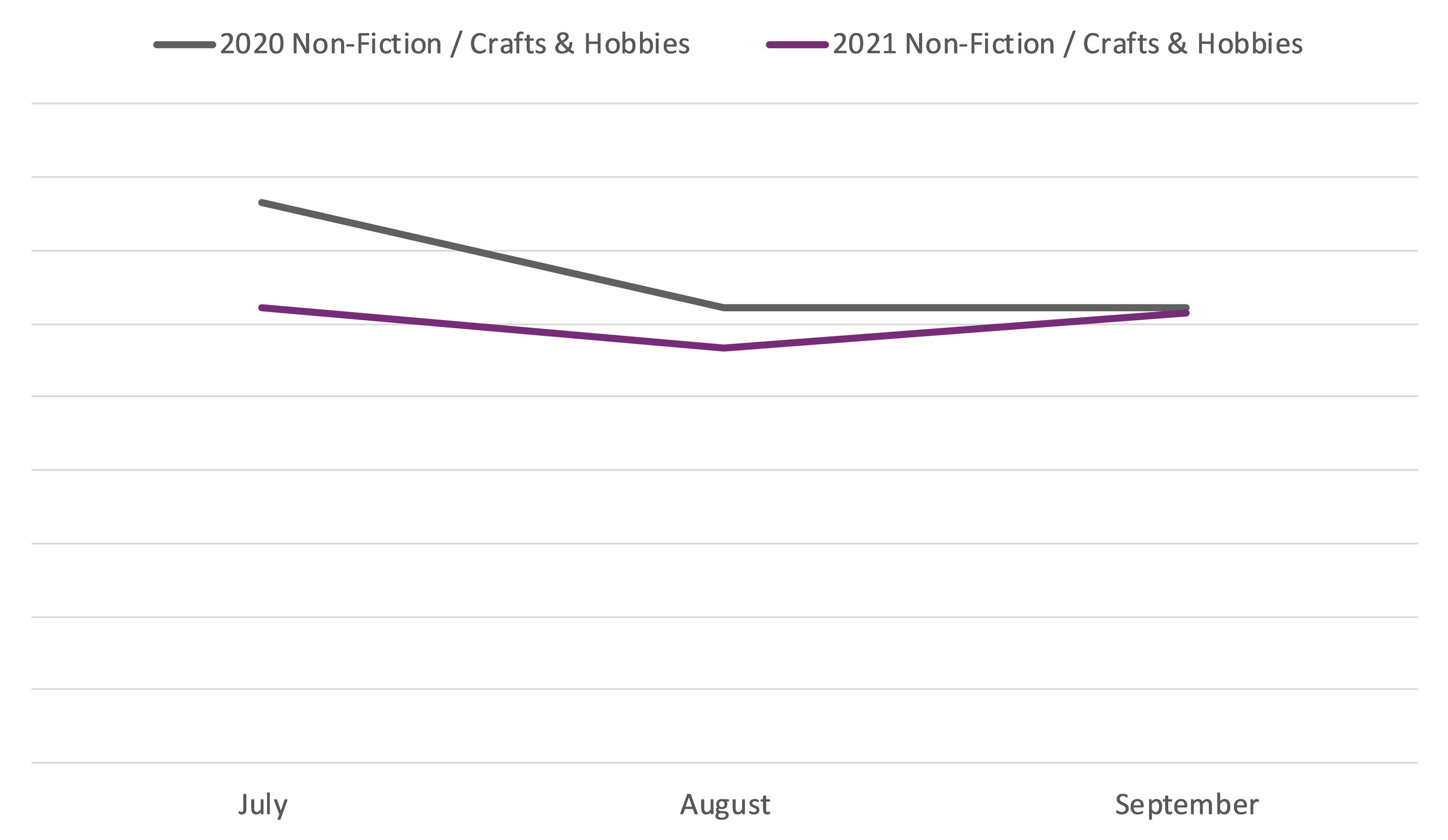 Looking at quarterly data from July to September 2020 and 2021, we see that sales of Crafts & Hobbies books were higher last year — at least during July and August. The most significant year-over-year difference happened in July where 2021 sales were 19% lower than 2020 sales. In August 2020, book sales for this subject category trended downwards, the year-over-year gap for this period was only 9% with 2021 sales still being lower. In 2020, sales from August to September stayed flat, but in 2021 they went back up by 9%, reaching almost the same number of books sold as in July.