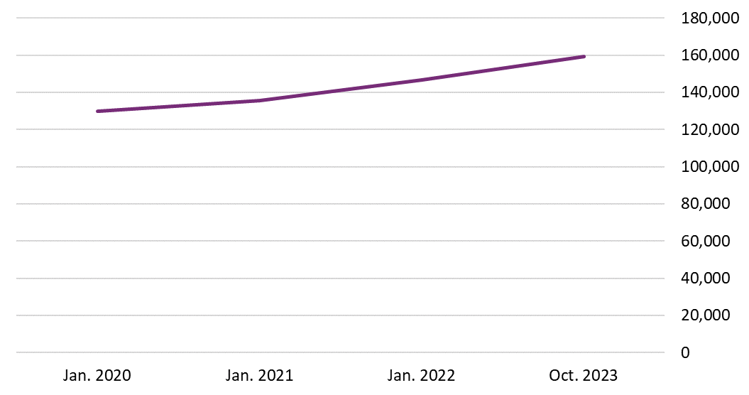 Over the years, the number of titles by Canadian contributors in our BiblioShare database has been consistently increasing, as seen in the graph below. From January 2020 to October 2023, the number of titles with a Canadian marker increased by 23%, with 8% of that increase happening from January 2022 to October 2023.
