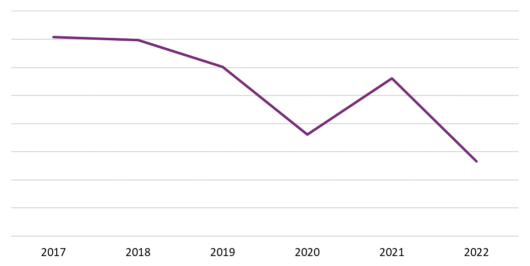 Using SalesData, we looked at the sales of print books by Canadian contributors over the last six years. From 2017 to 2022, the overall sales of Canadian titles have decreased by 13%, with the most significant drop happening in 2022 when sales decreased by 9% compared to 2021. In 2021, there was a noteworthy uptick in sales of 6% compared to 2020.