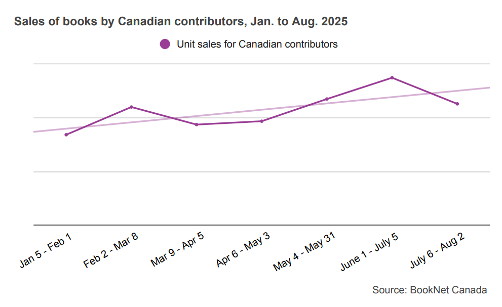 Overall, when we look at the unit sales for titles by Canadian contributors, we can see an upward trend from January of this year to the beginning of August. The data suggests that there seems to be increased interest in Canadian-authored books. As always, upticks in unit sales can be attributed to one or two high-performing titles, so it would be wise to keep an eye on this over time to see if the trend holds — and we will. (You can, too, if you’re a SalesData subscriber. Get in touch if you need help setting up this kind of report!)